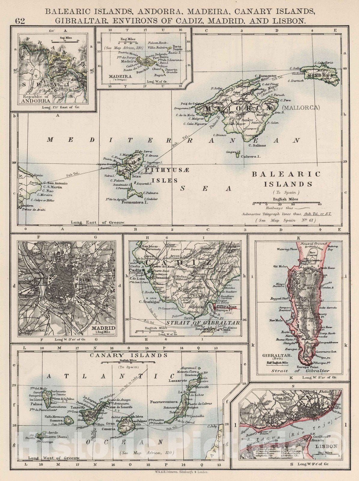 Historic Map : 1906 Balaeric Islands, Andorra, Madeira, Canary Islands, Gibraltar, Environs of Cadiz, Madrid, and Lisbon. - Vintage Wall Art