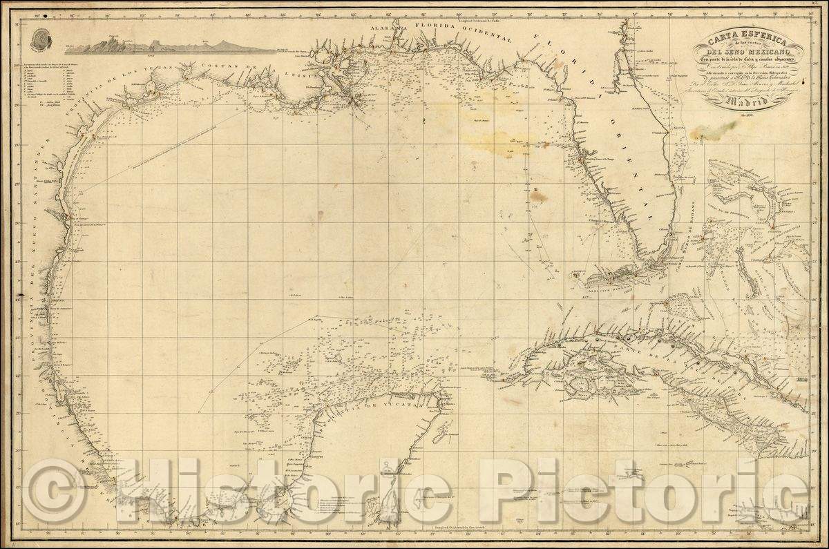 Historic Map - Carta Esferica de las costas Del Seno Mexicano/Spanish Sea Chart of the Gulf Coast, Florida, Texas, 1836, Direccion Hidrografica de Madrid - Vintage Wall Art