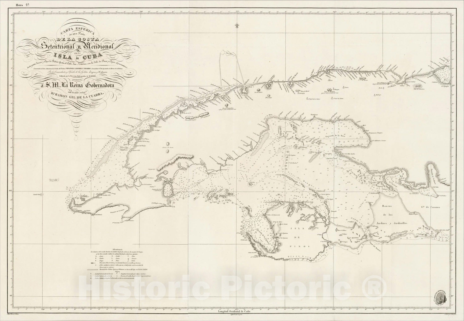 Historic Map : Carta Esferica De Una Parte de la Costa Setentrional y Meridional de la Isla de Cuba, 1837, Direccion Hidrografica de Madrid, Vintage Wall Art