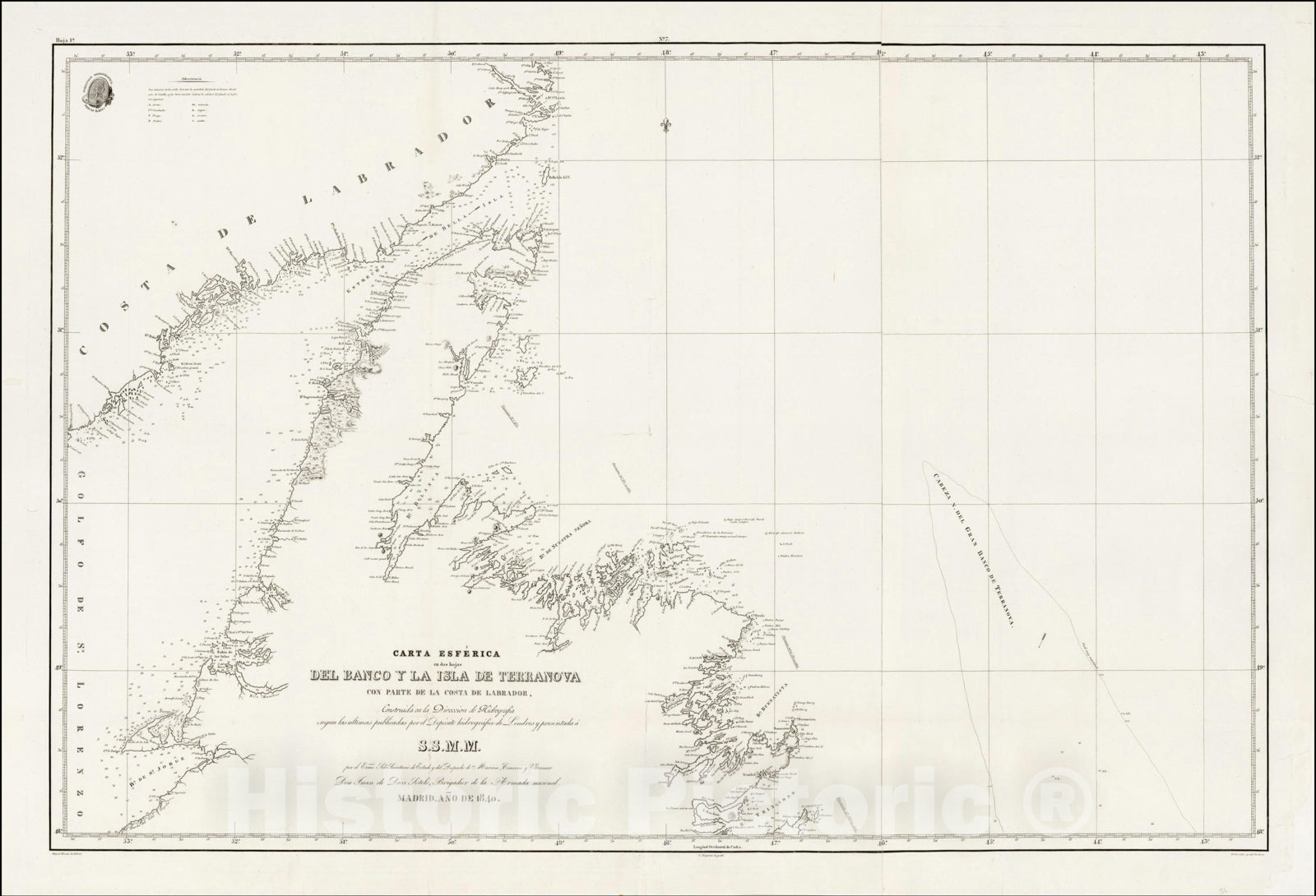 Historic Map : Carta Esferica en dos hojas Del Banco y La Isla De Terranova con parte de la Costa de Labrador, 1840, Direccion Hidrografica de Madrid, Vintage Wall Art