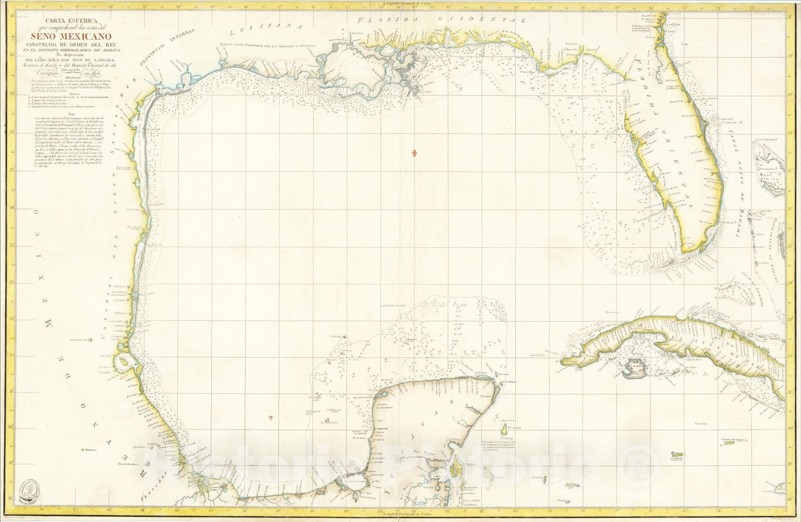 Historic Map : Carta esf?ica que comprehende las costas del Seno Mexicano construida de orden, 1805, Direccion Hidrografica de Madrid, Vintage Wall Art