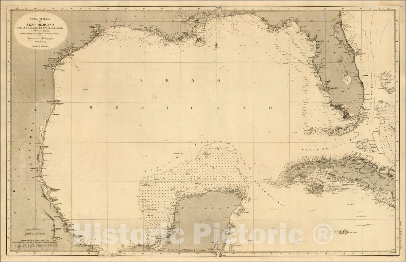 Historic Map : Carta General Del Seno Mejicano Con Los Canales De Yucatan, Florida y Nuevo De Bahama, 1869, 1876, Direccion Hidrografica de Madrid, Vintage Wall Art