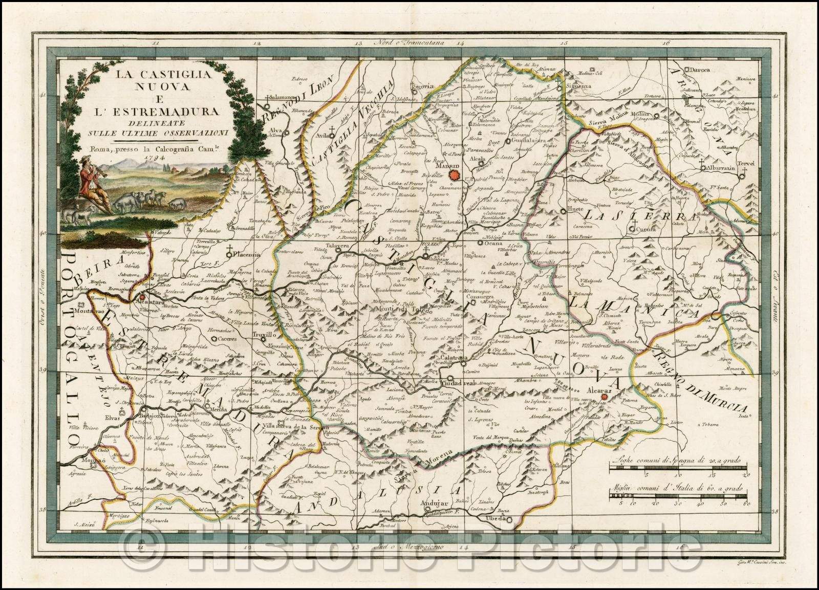 • .Historic Map - La Castiglia Nuova E L'Estremadura Delineate :: Regional of the Castille and Nova Extremadura, Madrid, Toledo, Segovia, Avila, and Plancenzia, 1794 - Vintage Wall Art
