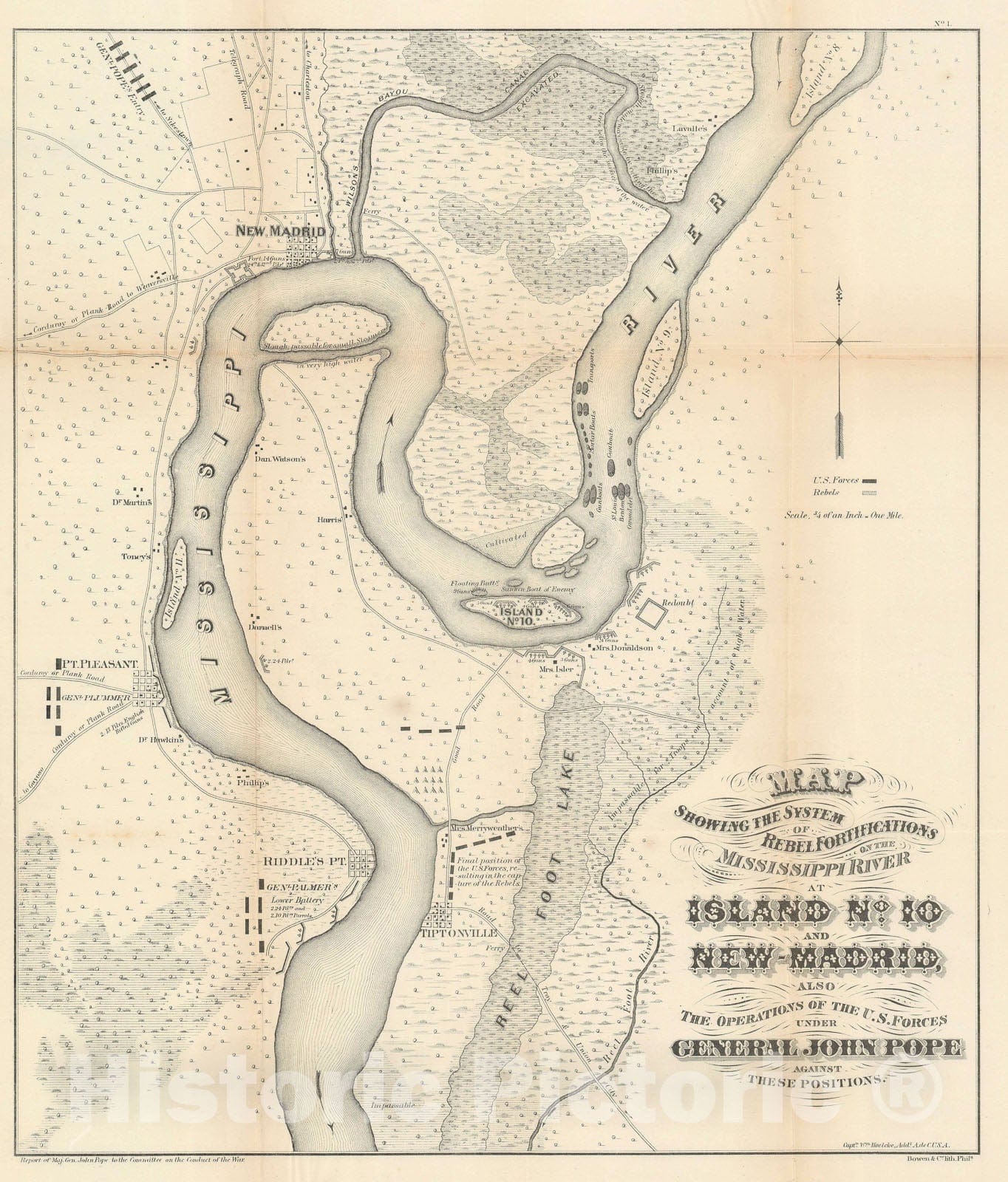 • .Historic Map : The Mississippi River around New Madrid, MO, John Pope, 1862, Vintage Wall Art