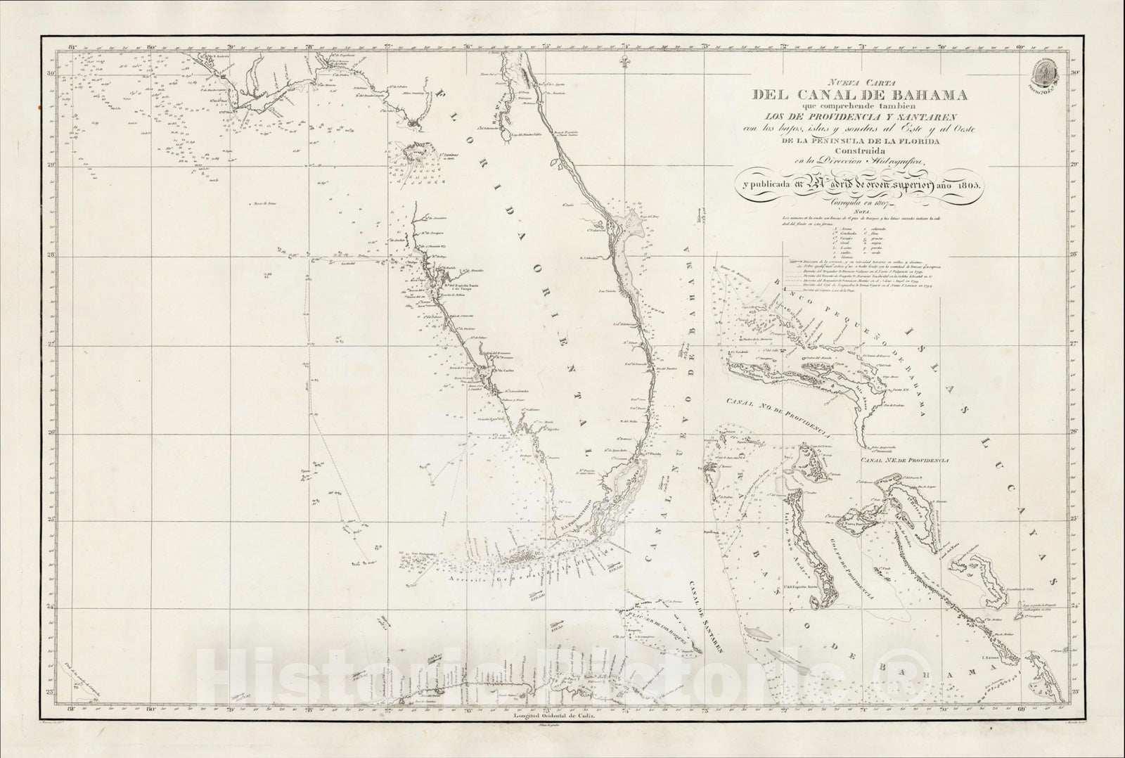• .Historic Map : Nueva Carta Del Canal De Bahama que comprehende tambien Los Providencia, 1807, Direccion Hidrografica de Madrid, v1, Vintage Wall Art