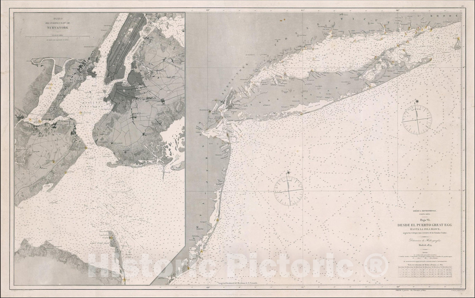 Historic Map : Plano Del Puerto y Bahia De Nueva-York with Hoja VI Desde El Puerto Great Egg Hasta La Isla Block, 1874, 1874, Direccion Hidrografica de Madrid, Vintage Wall Art