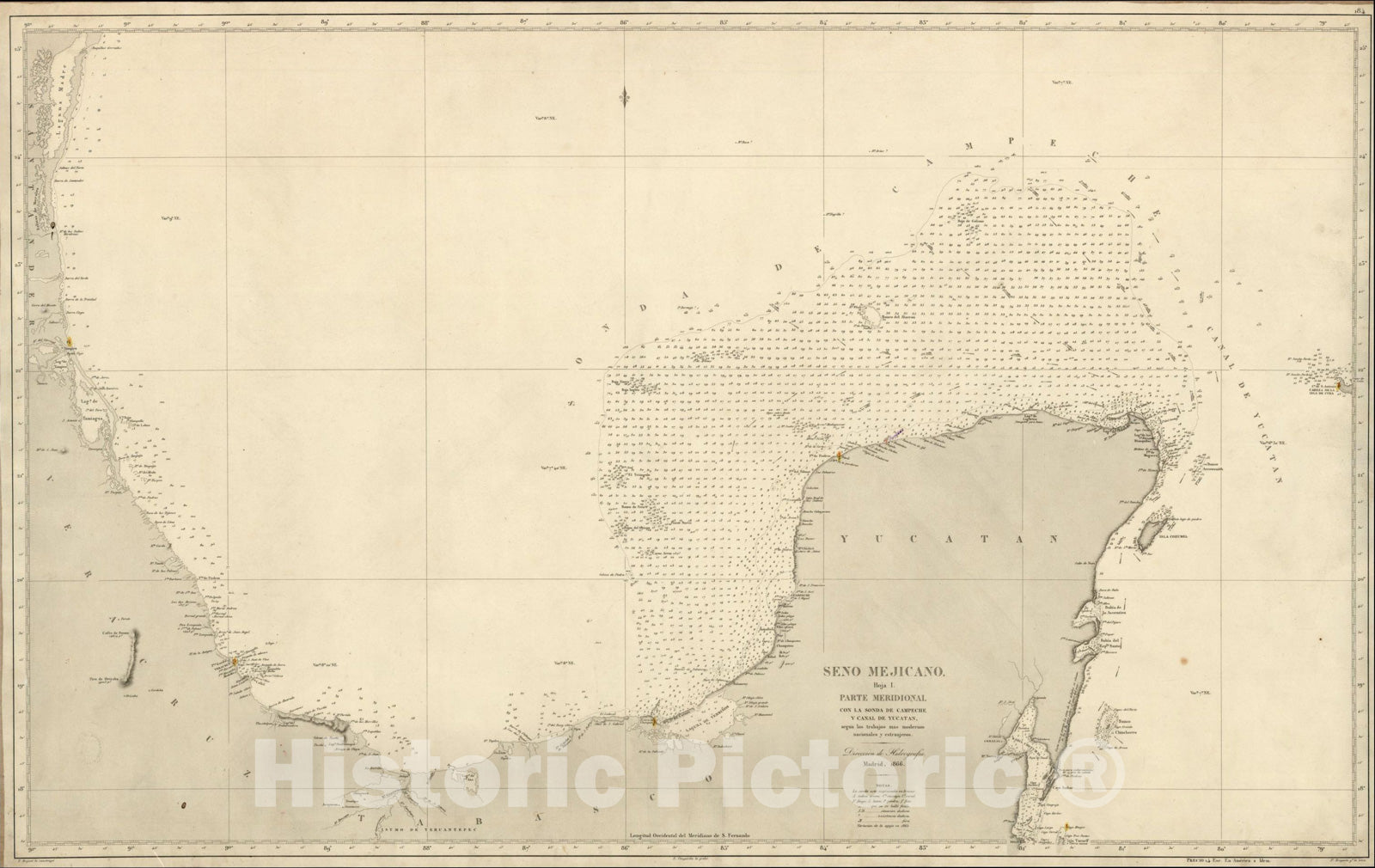 • .Historic Map : Seno Mejicano Hoja I. Parte Meridional con la Sonda de Campeche y Canal de Yucatan, 1866, Direccion Hidrografica de Madrid, Vintage Wall Art