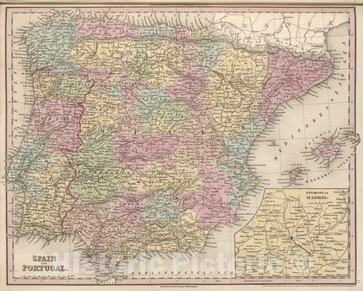 Historic Map : Spain and Portugal. (Inset) Environs of Madrid, 1836 Atlas - Vintage Wall Art