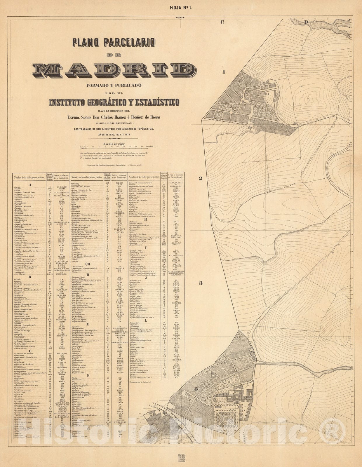 Historic Map : Title Page/Index: Hoja No. 1. Plano parcelario de Madrid, 1874, Vintage Wall Decor