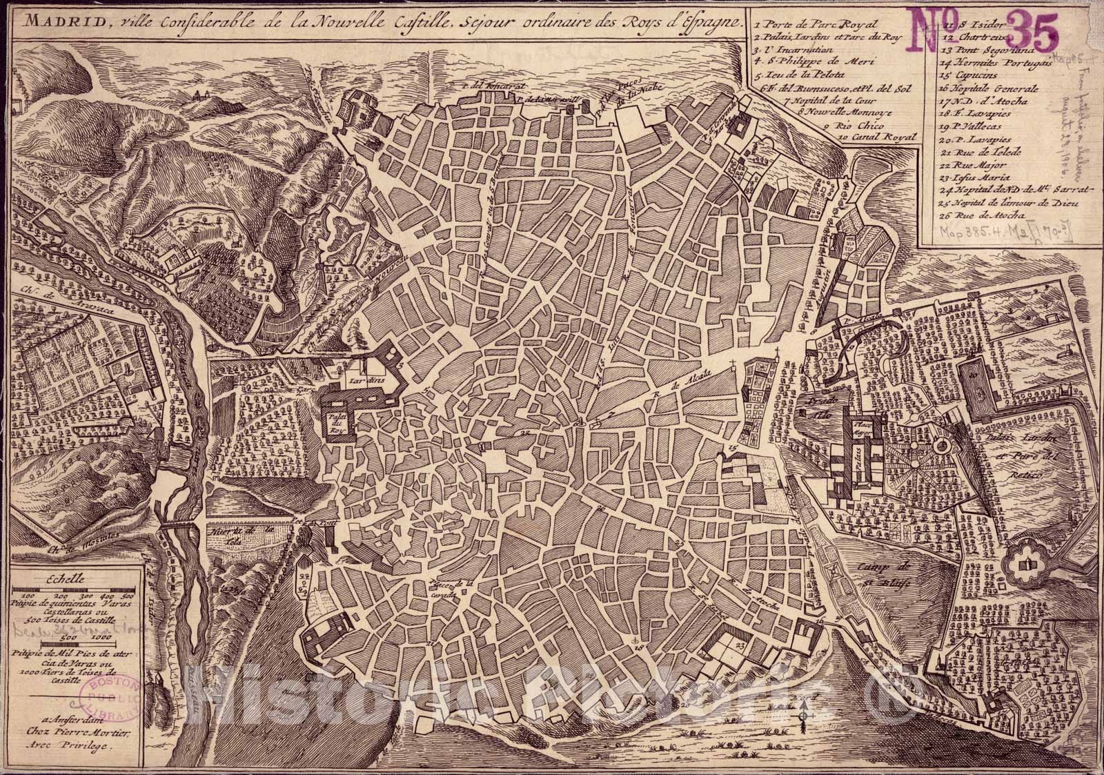 • .Historical Map, 1702 Madrid, Ville considerable de la Nouvelle Castille, sejour ordinaire des Roys d'Espagne, Vintage Wall Art