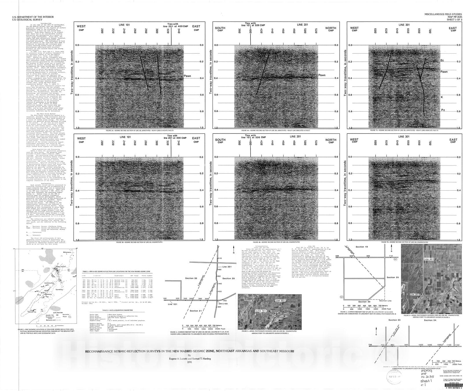 Map : Reconnaissance seismic reflection surveys in the New Madrid seismic zone, northeast Arkansas and southeast Missouri, 1991 Cartography Wall Art :
