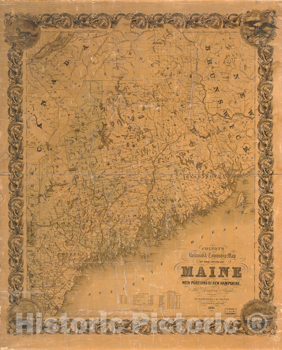 Historic 1852 Map - Colton's Railroad & Township map of The State of Maine, with portions of New Hampshire, New Brunswick & Canada