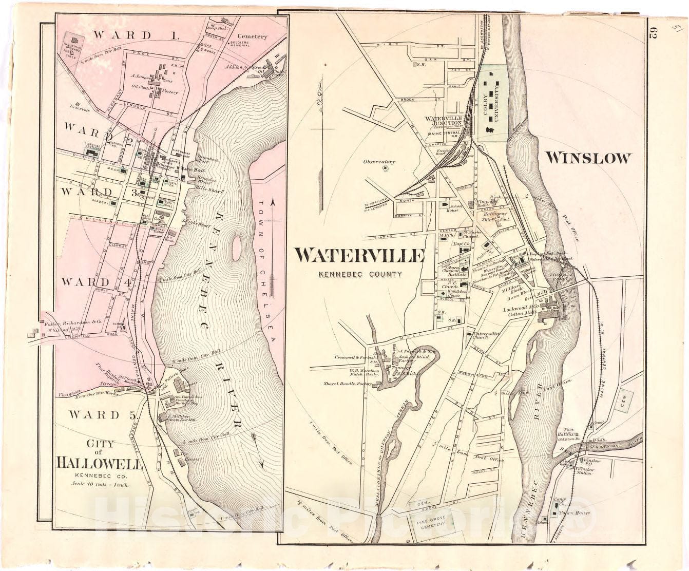 • Historic 1887 Map - Colby's Atlas of The State of Maine - City of Hallowell; Waterville