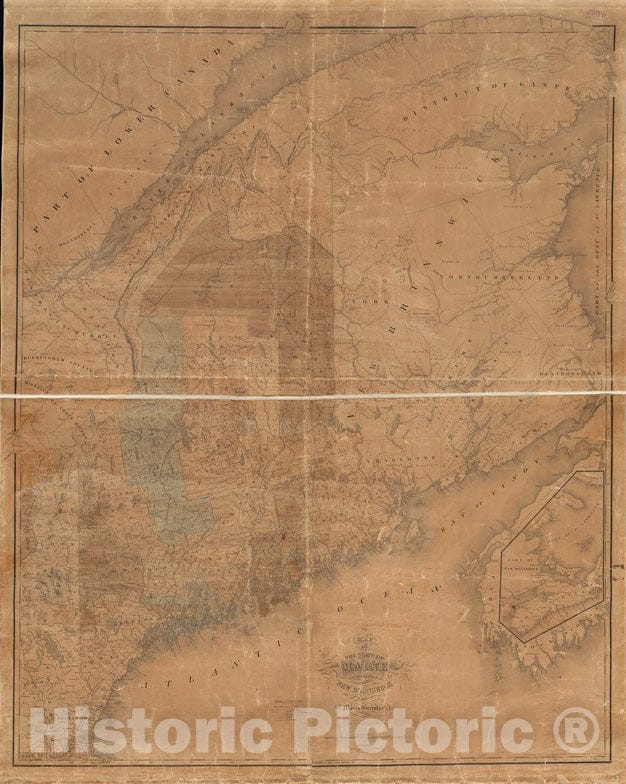 • .Historical Map, 1844 Map of the state of Maine with the province of New Brunswick, Vintage Wall Art