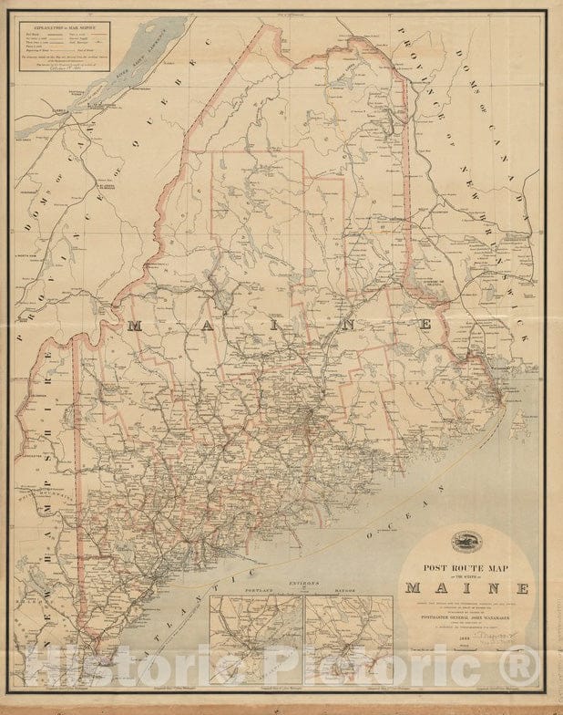 Historical Map, 1888 Post Route map of The State of Maine Showing Post Offices with The Intermediate Distances and Mail Routes in Operation on The 1st of October 1891, Vintage Wall Art