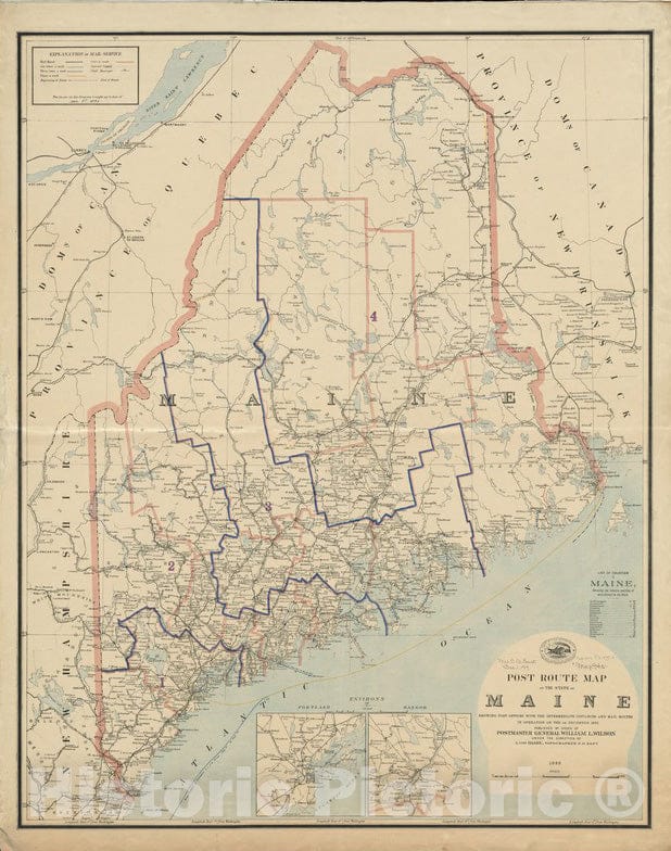 Historical Map, Post Route map of The State of Maine Showing Post Offices with The Intermediate Distances and Mail Routes in Operation on The 1st December 1895, Vintage Wall Art