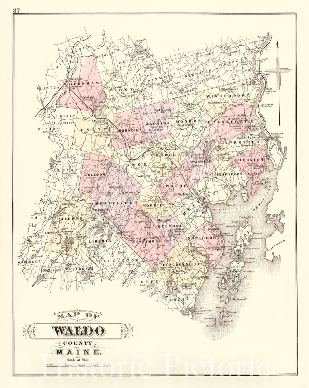 Historic 1887 Map - Colby's Atlas of The State of Maine - Map of Waldo County Maine