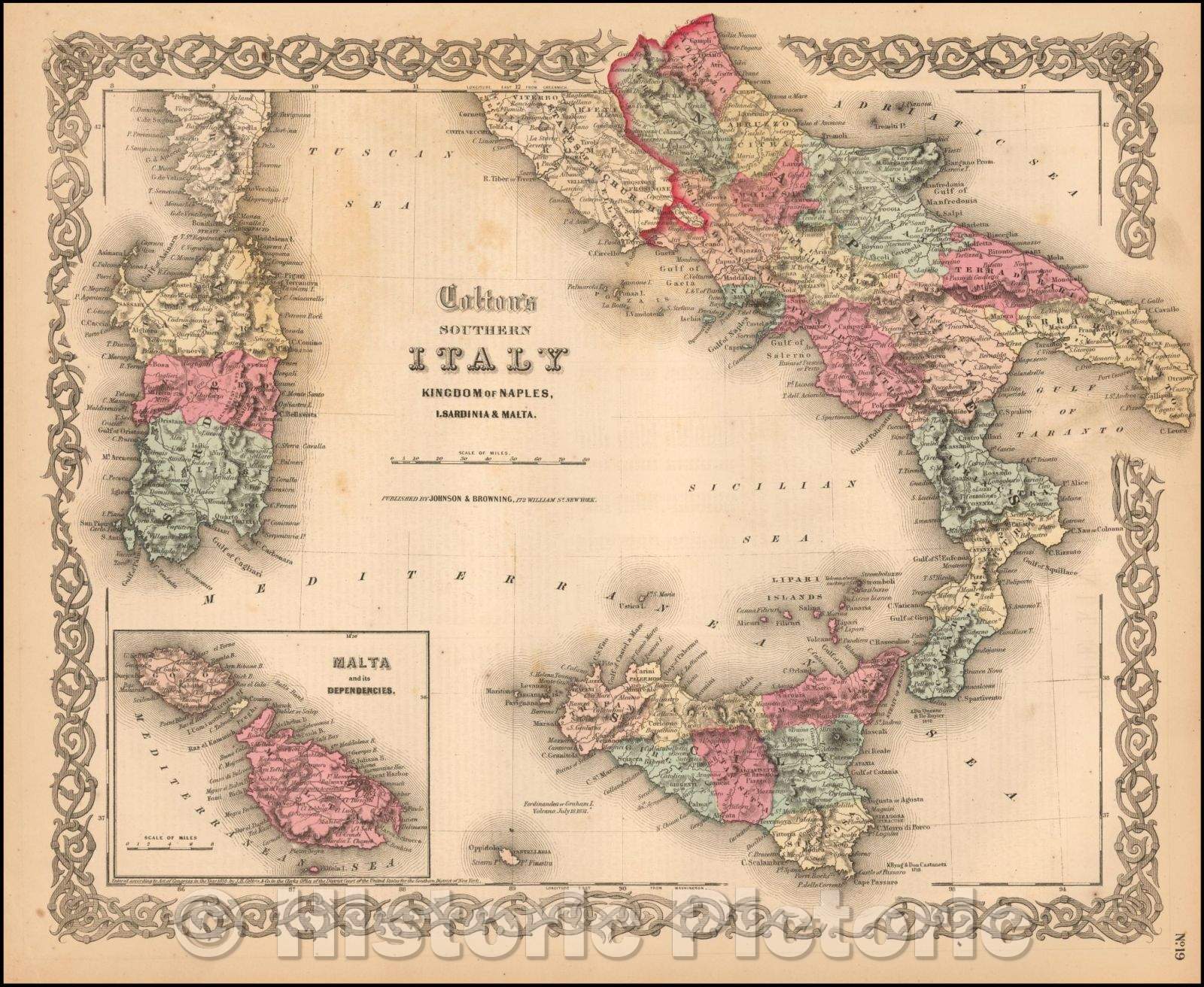 • .Historic Map - Colton's Southern Italy Kingdom of Naples, I Sardinia & Malta, 1860, Joseph Hutchins Colton - Vintage Wall Art