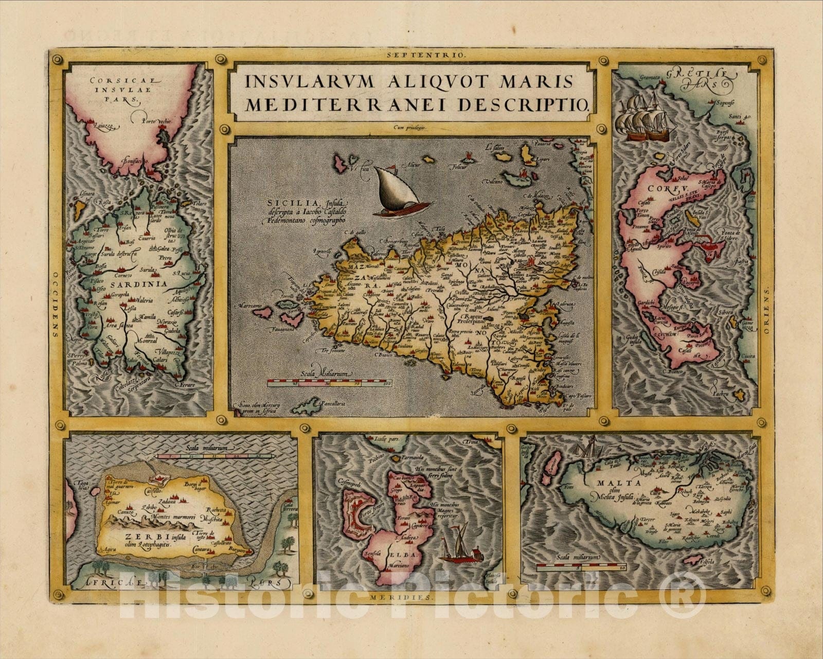 Historic Map : Insularum Aliquot Maris Mediterranei Descriptio [Sicily, Malta, Sardinia, Corfu, Elba and Zerbia], 1608, , Vintage Wall Art