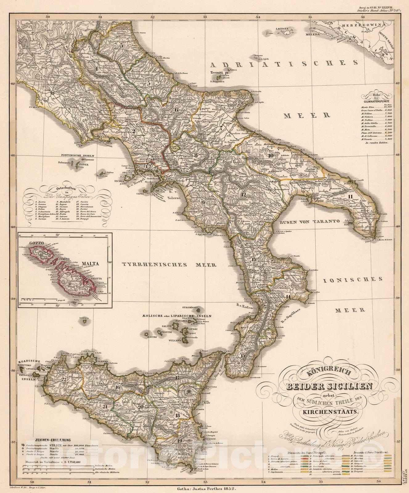 Historic Map : Konigreich Beider Sicilien .... (Northern Italy. Malta)., 1852, Vintage Wall Art