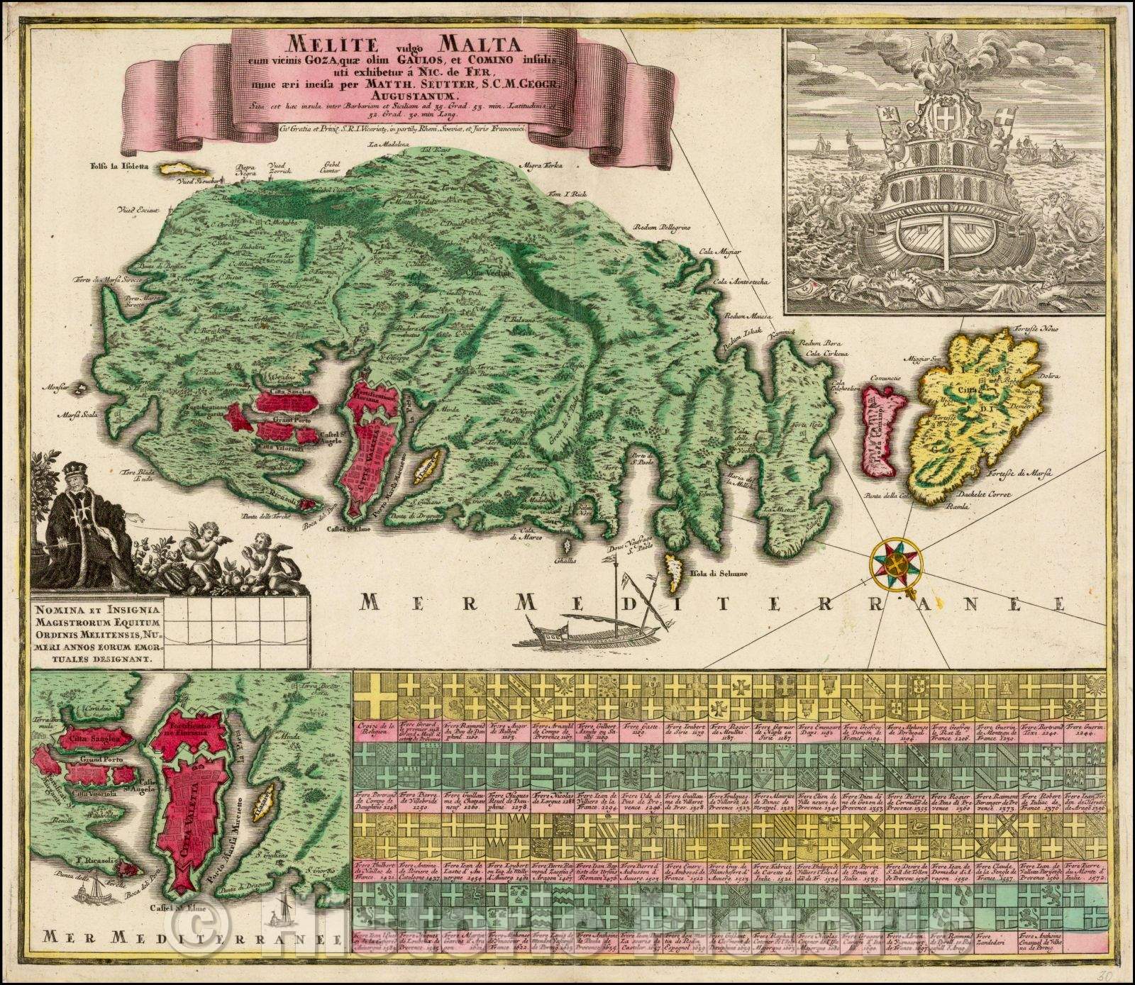 • .Historic Map - Melite vulgo Malta cum vicinis Goza, quae olim Gaulos, et Comino insulis/Seutter's Map of the Island of Malta and environs, 1740 - Vintage Wall Art