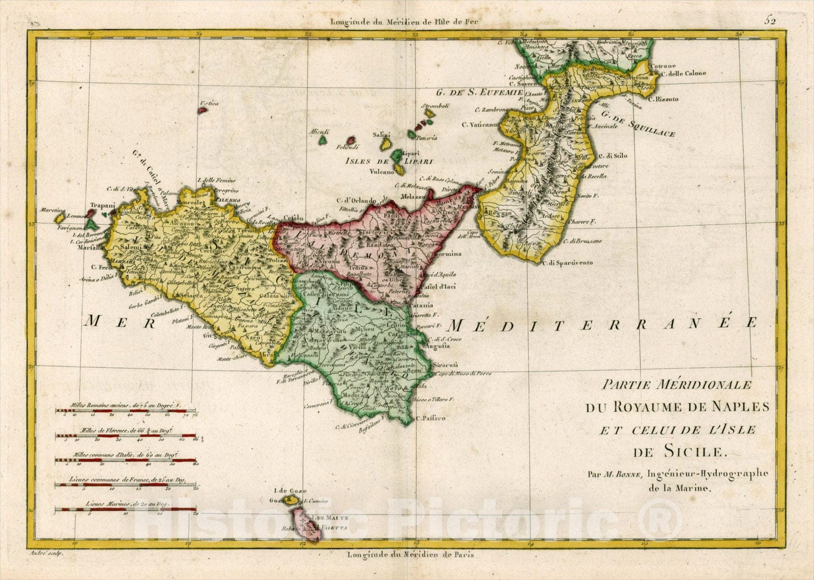 Historic Map : Partie M?idionale du Royaume de Naples et Celui de L'Isle de Sicile [shows Malta], 1780, Rigobert Bonne, Vintage Wall Art