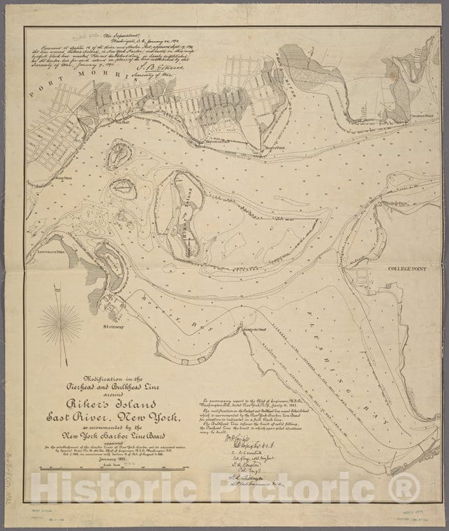 • .Historic 1893 Map - Modification In The Pierhead And Bulkhead Line Around Rikers Islof New York City And State - Manhattan - Vintage Wall Art