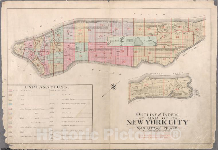 Historic 1897 Map - Outline And Index Map Of Atlas Of New York City : Manhattan Isla