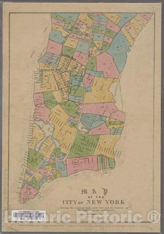 • .Historic Map - 1852 Manhattan (New York, N.Y.), Of The City Of New York : Shewing The Original High Water Line And The Location Of The Different Farms And Estates. - Vintage Wall Art