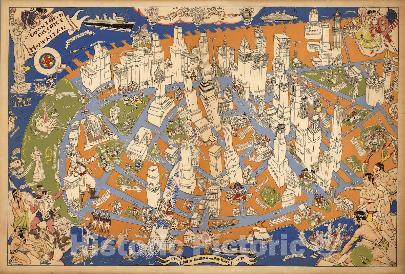 Historic Map : Downtown district of Manhattan. Drawn by A. Zaidenberg 1938 - Vintage Wall Art