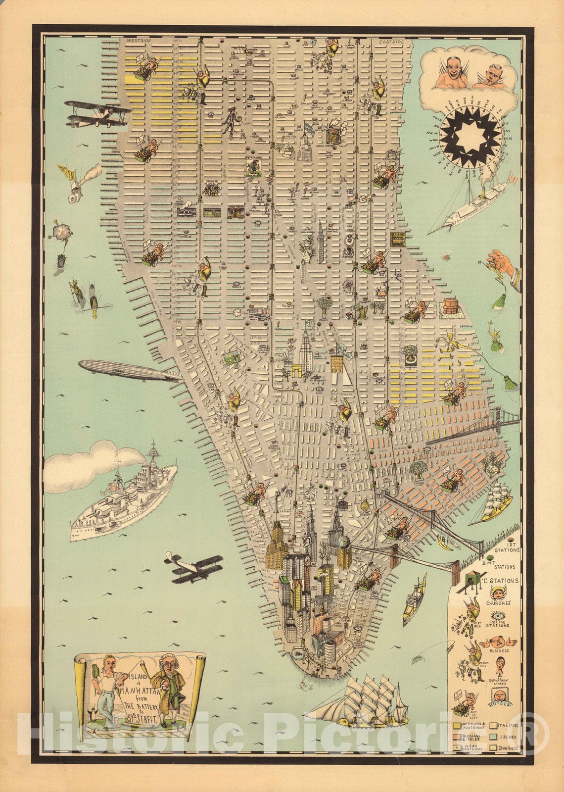 • .Historic Map : Island of Manhattan from the Battery to 59th Street 1927 - Vintage Wall Art