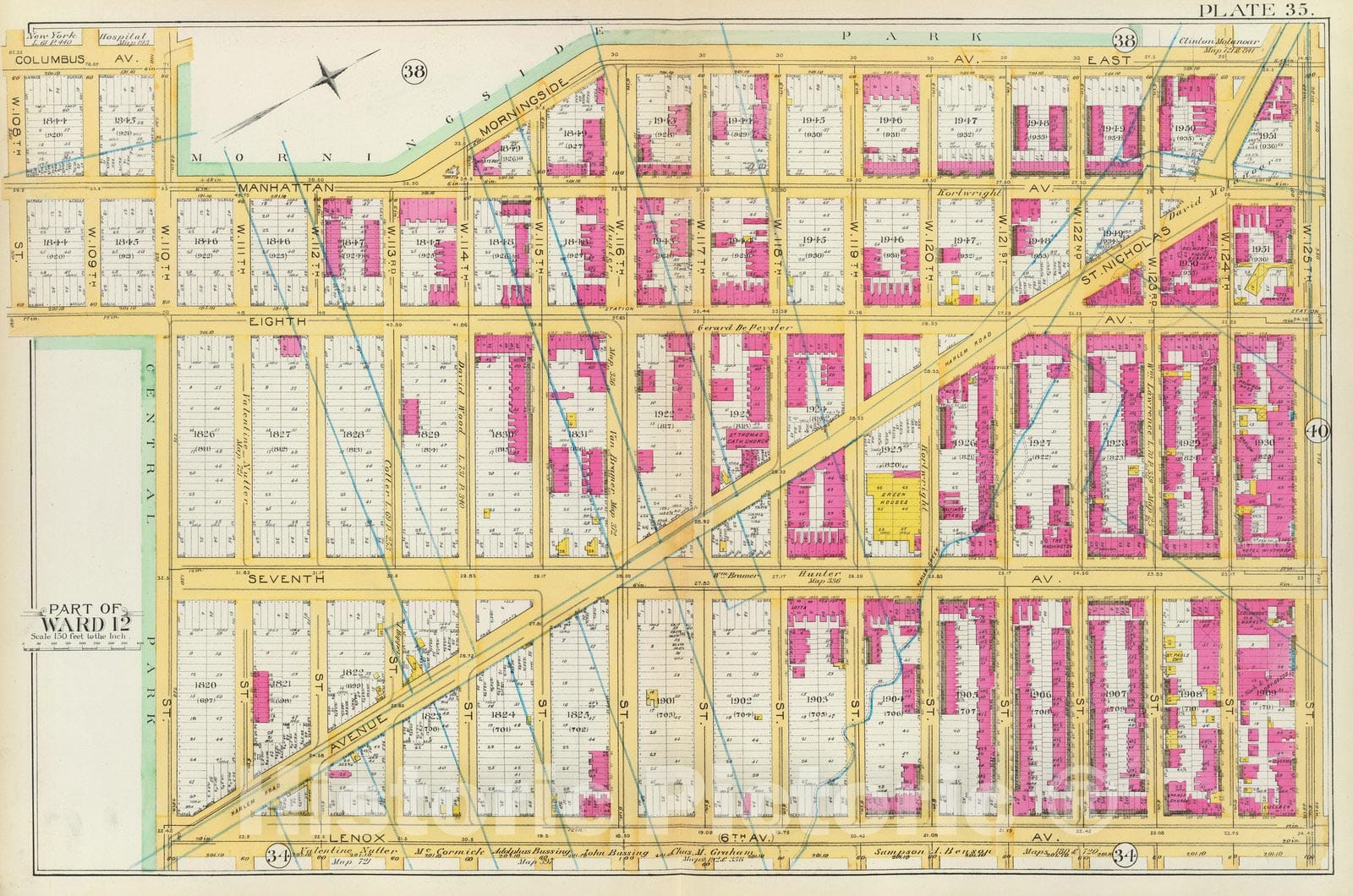 • .Historic Map : Manhattan Fire Insurance City Atlas Map, Pl. 35: ward 12. 1891 - Vintage Wall Art