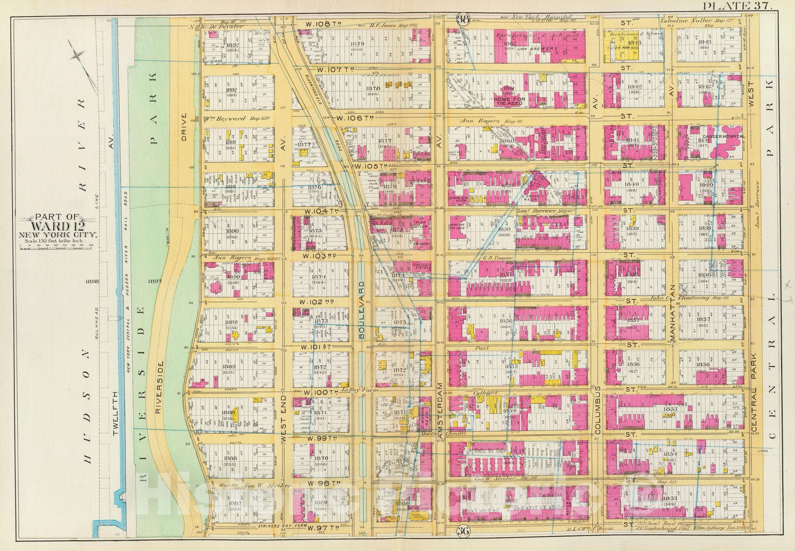 Historic Map : Manhattan Fire Insurance City Atlas Map, Pl. 37: ward 12. 1891 - Vintage Wall Art