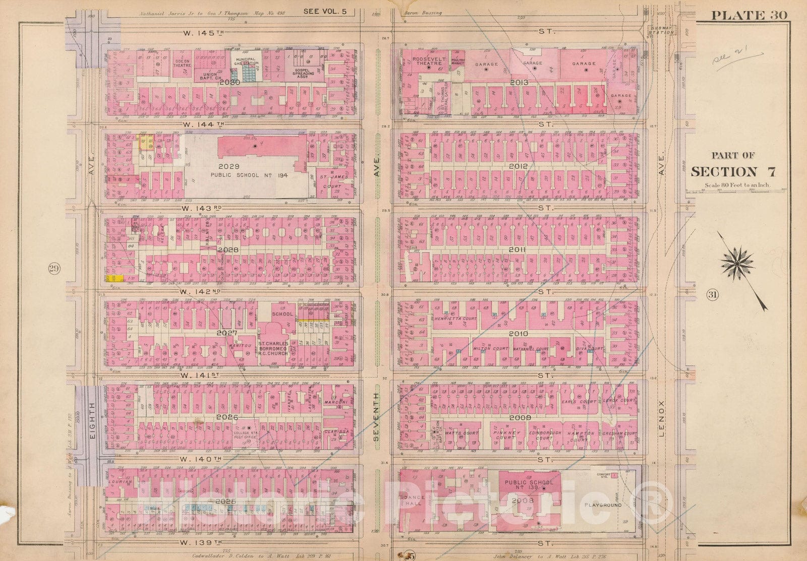 Historic Map : Atlas City of New York, Borough of Manhattan, Volume 4, 110th St to 145th St, Manhattan 1914 Plate 030 , Vintage Wall Art