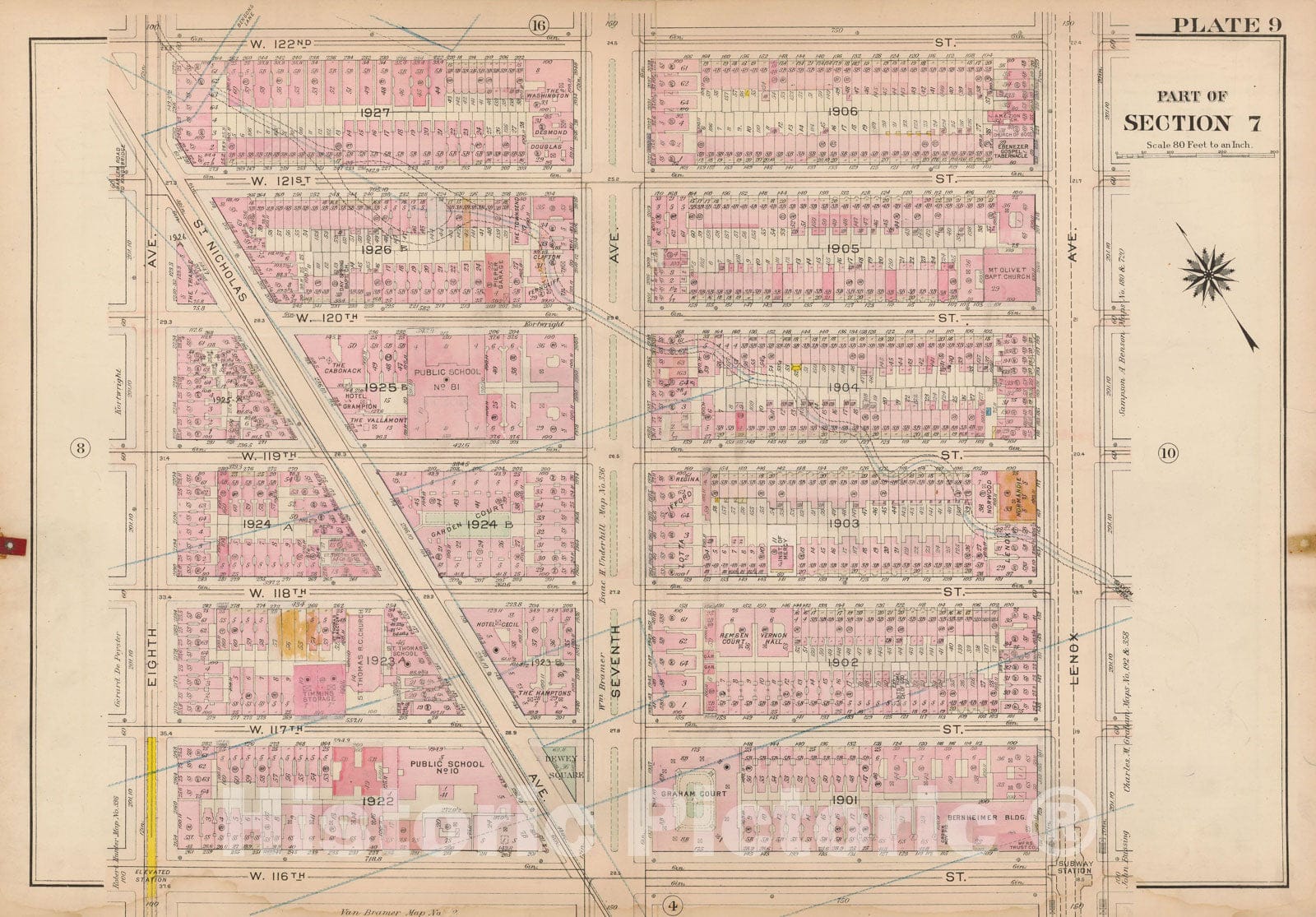 Historic Map : Atlas City of New York, Borough of Manhattan, Volume 4, 110th St to 145th St, Manhattan 1914 Plate 009 , Vintage Wall Art