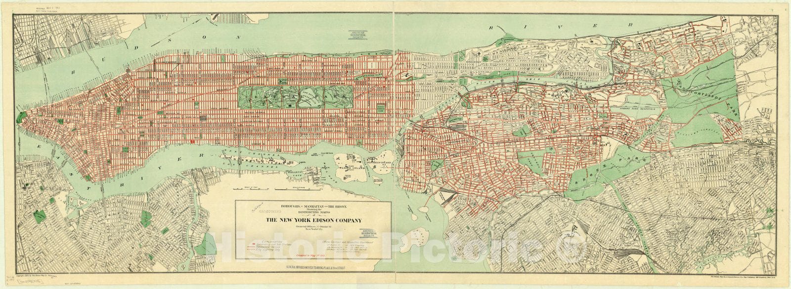 Map : Manhattan and the Bronx 1913, Boroughs of Manhattan and the Bronx showing the distributing mains of the New York Edison Company, Antique Vintage Reproduction