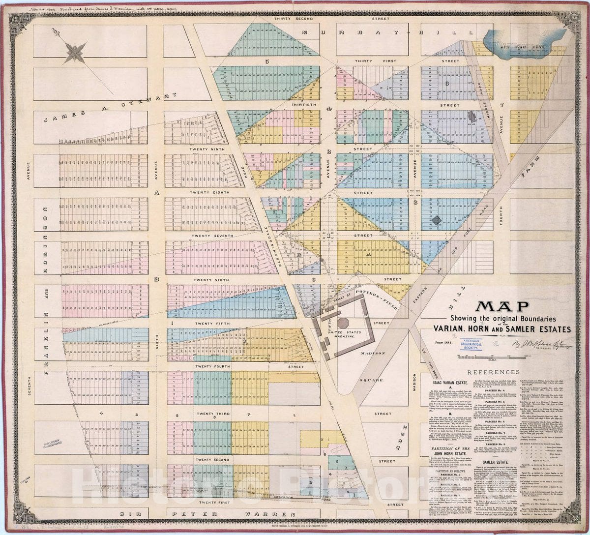Map : Manhattan, New York 1884, Map showing the original boundaries of the Varian, Horn and Samler estates , Antique Vintage Reproduction