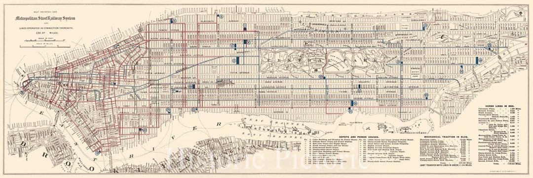 Historic 1899 Map - Map Showing The Metropolitan Street Railway System and Lines Operated in Connection therewith : 232.07 Miles : Borough of Manhattan, New York City