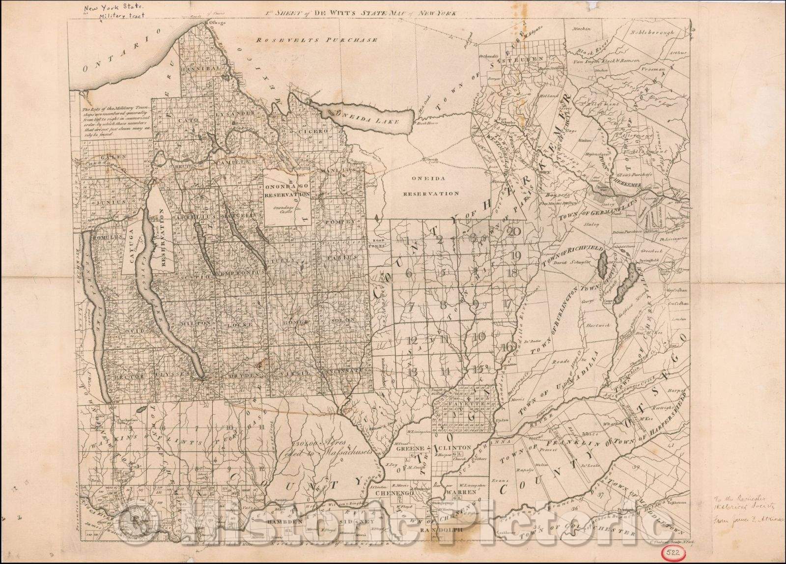 • .Historic Map - 1st sheet of De Witt's State Map of New-York (with contemporary manuscript annotations), 1793, Simeon De Witt - Vintage Wall Art