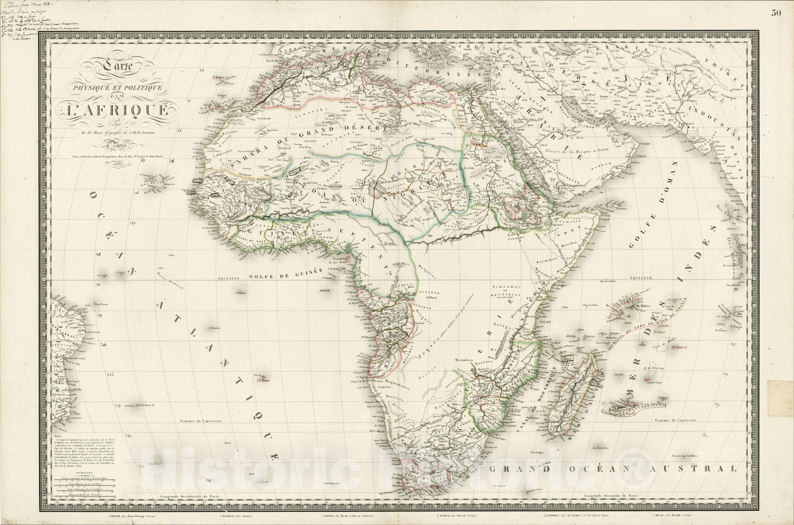 • .Historic Map : Carte de Physique et Politique de L'Afrique, 1822 (with contemporary manuscript annotations), 1822, , Vintage Wall Art