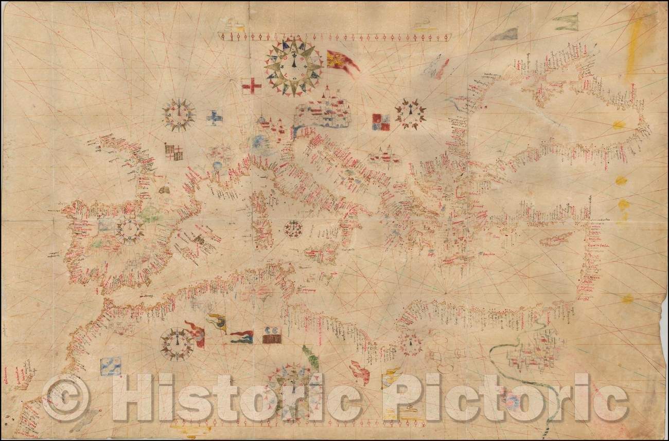 • .Historic Map - Manuscript Portolan Chart of the Mediterranean, 1559, Mateo Prunes - Vintage Wall Art