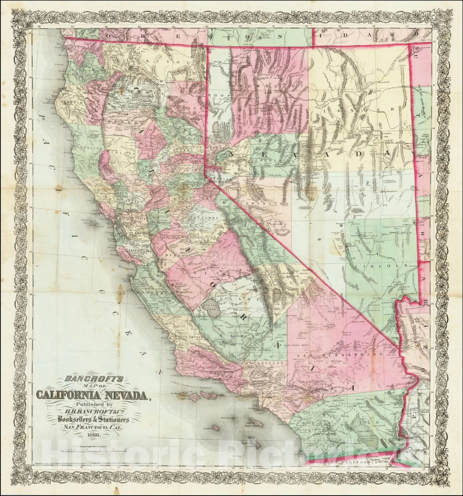 Historic Map : Bancroft's California and Nevada Published by H.H. Bancroft & Co. Booksellers & Stationers... 1868, 1868, Vintage Wall Art