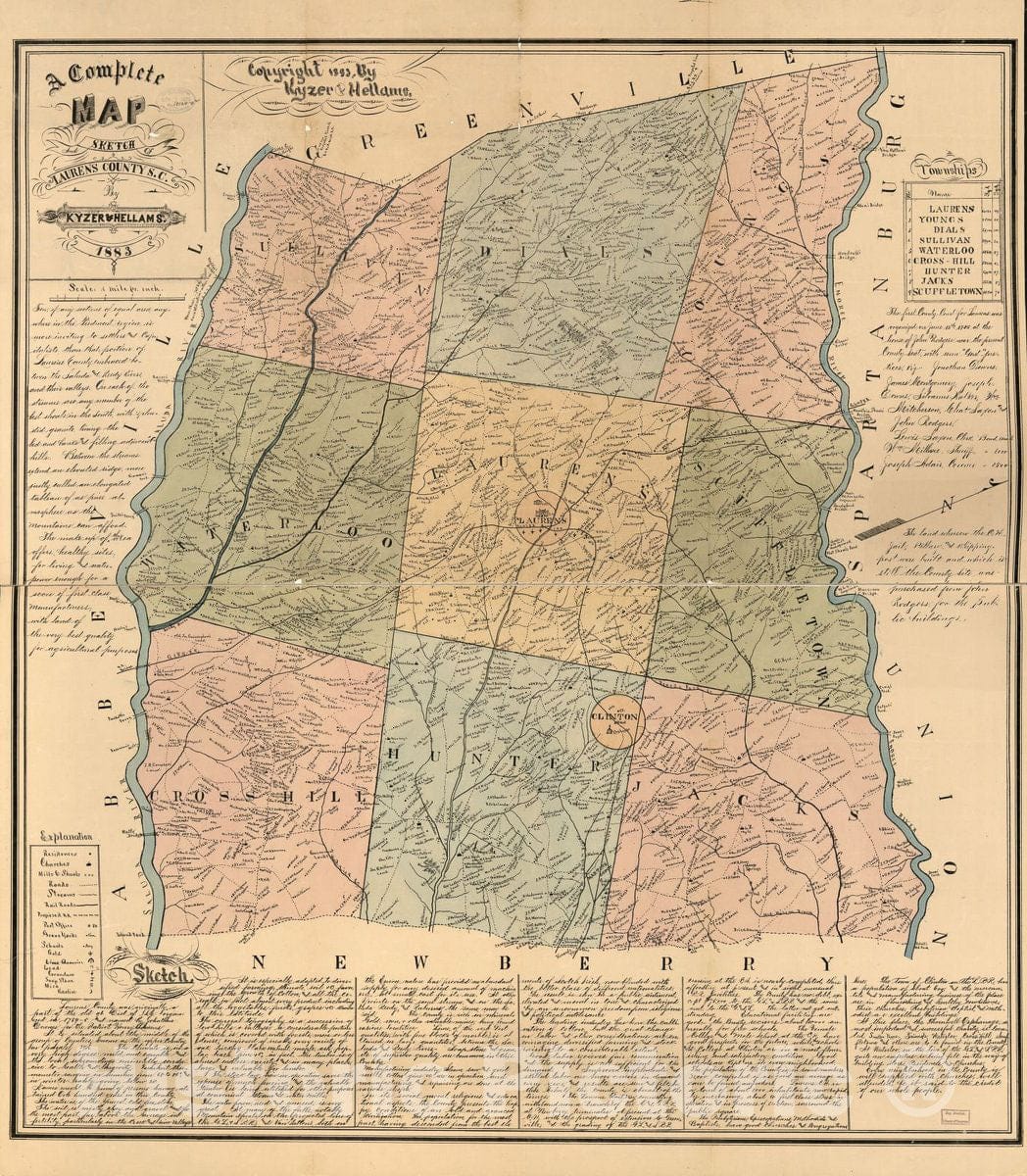Historic 1883 Map - A Complete map and Sketch of Laurens County, S.C.