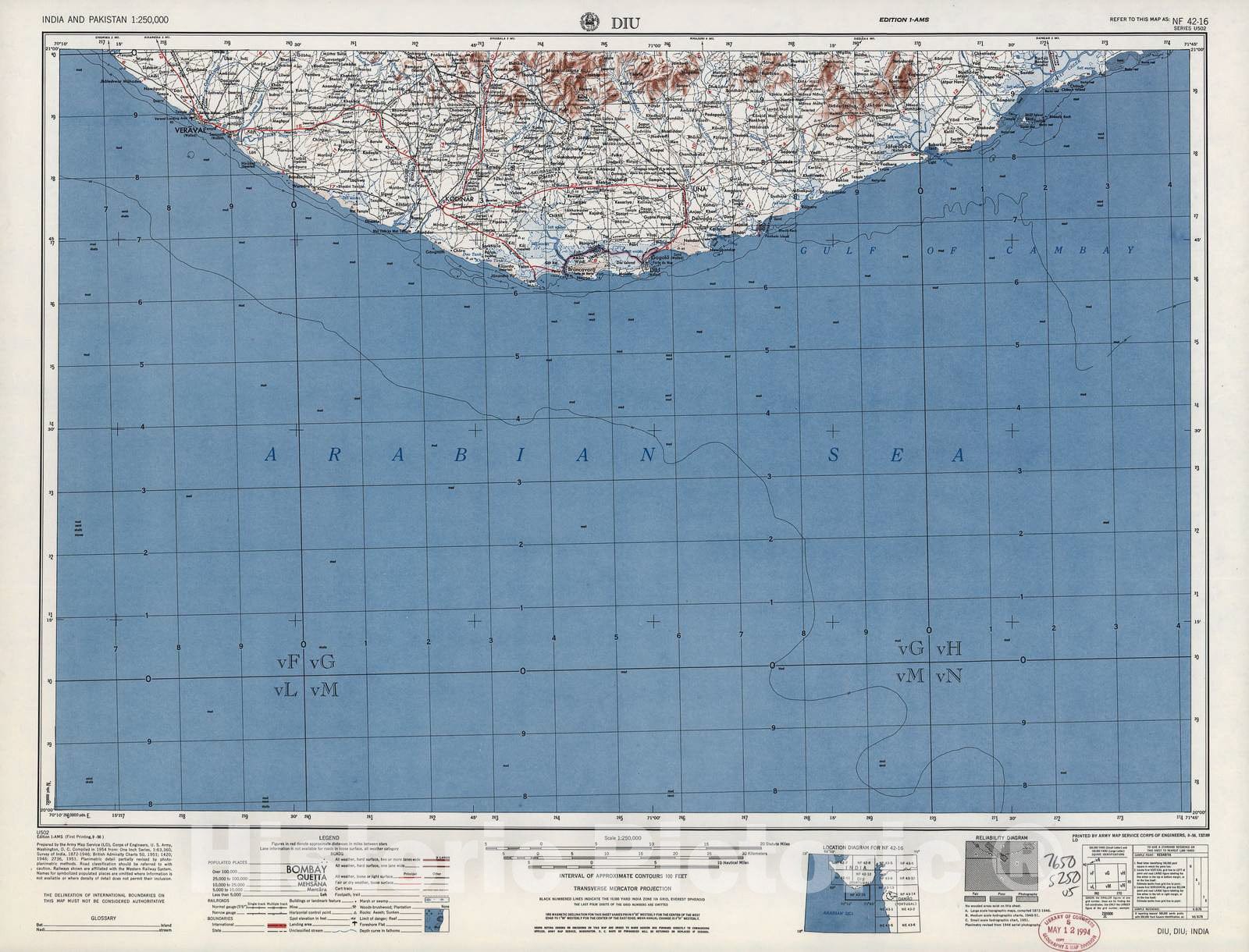Historic 1955 Map - India and Pakistan 1:250,000. - Diu, 1956