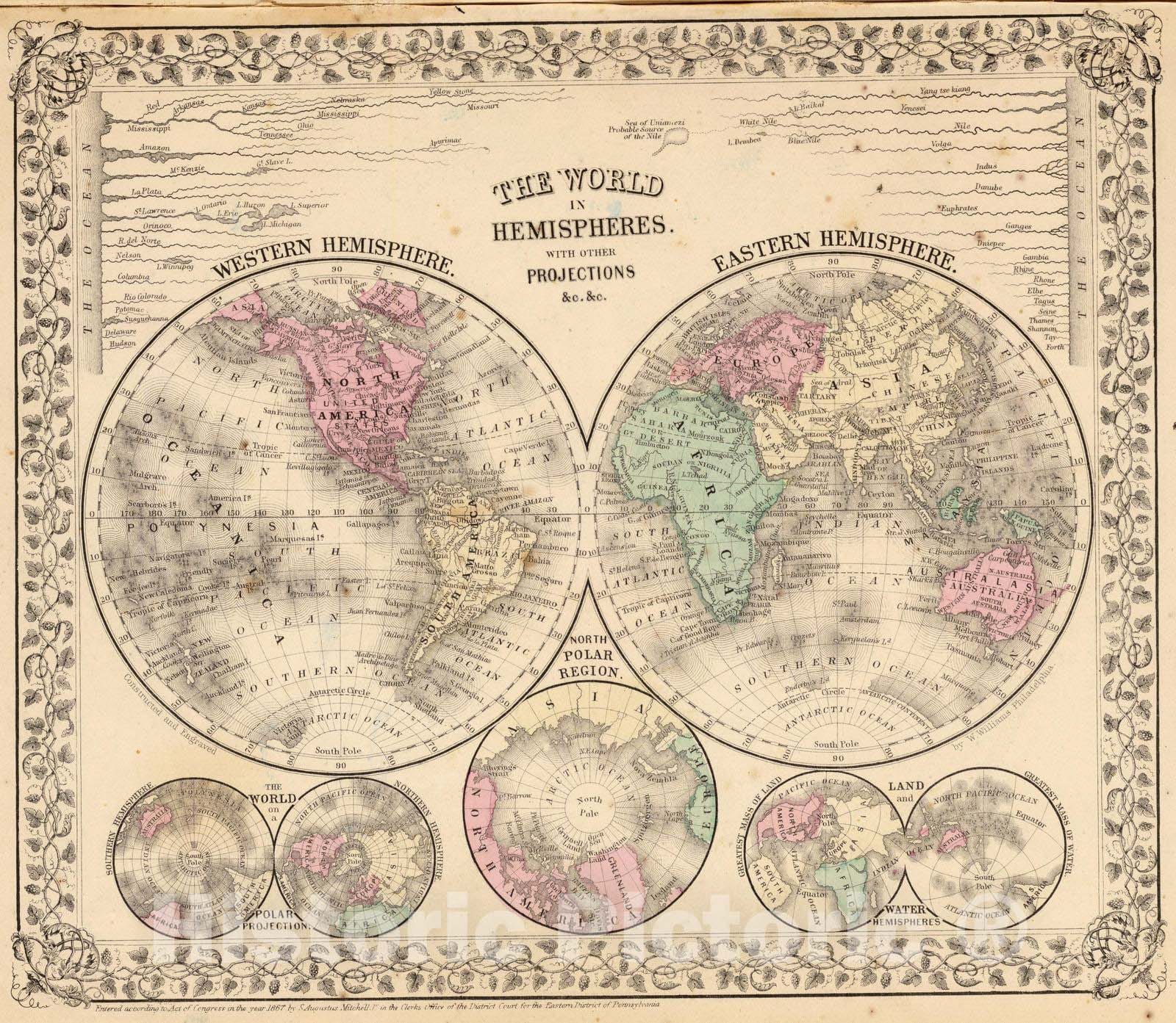 Historic Map : 1870 World hemispheres. - Vintage Wall Art