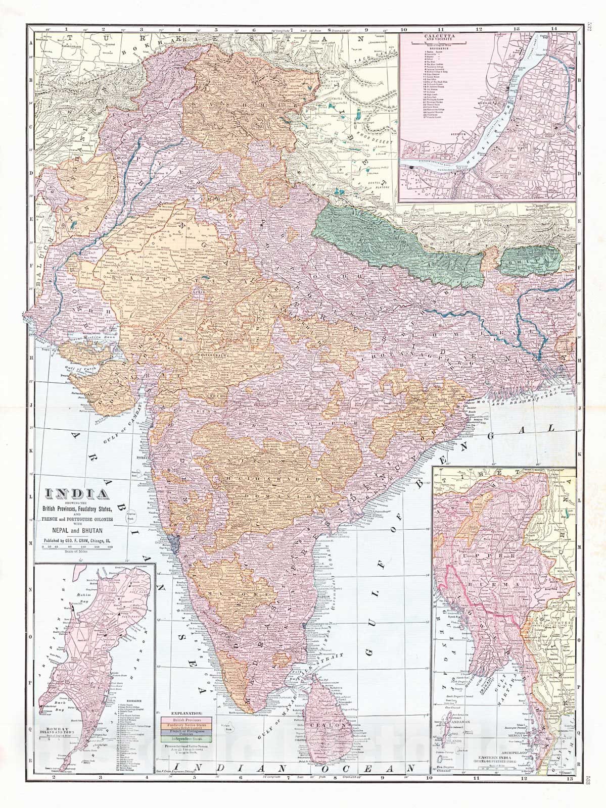 Vintage Map | 1900 India Showing the British Provinces, Feudatiry States, and French and Portuguese Colonies with Nepal and Bhutan | Cram, George F.