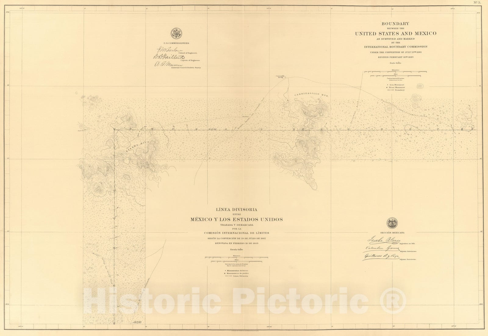 • .Historic Map : Mexico, Northern Mexico 1901 Linea Divisoria Entre Mexico Y Los Estados Unidos. No. 3. , Vintage Wall Art