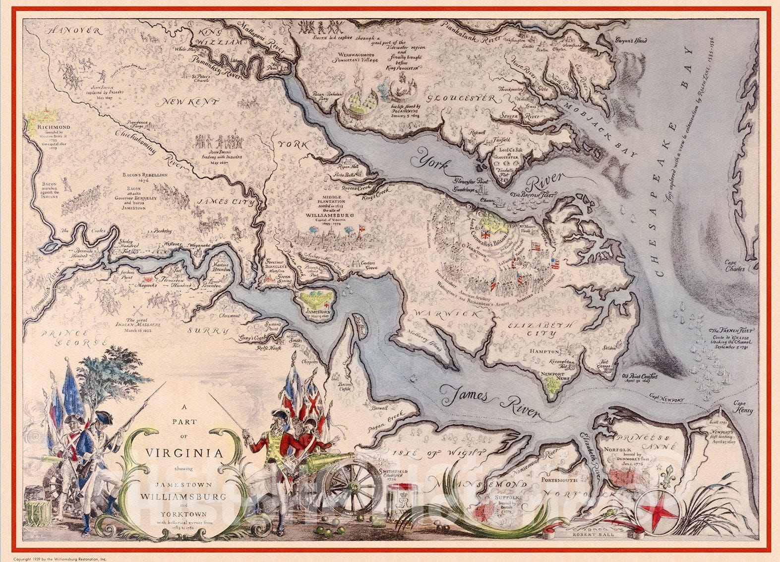 Historic Map - A Part of Virginia showing Jamestown, Williamsburg and Yorktown, with historical events from 1585-1781, Historic Map - Vintage Wall Art