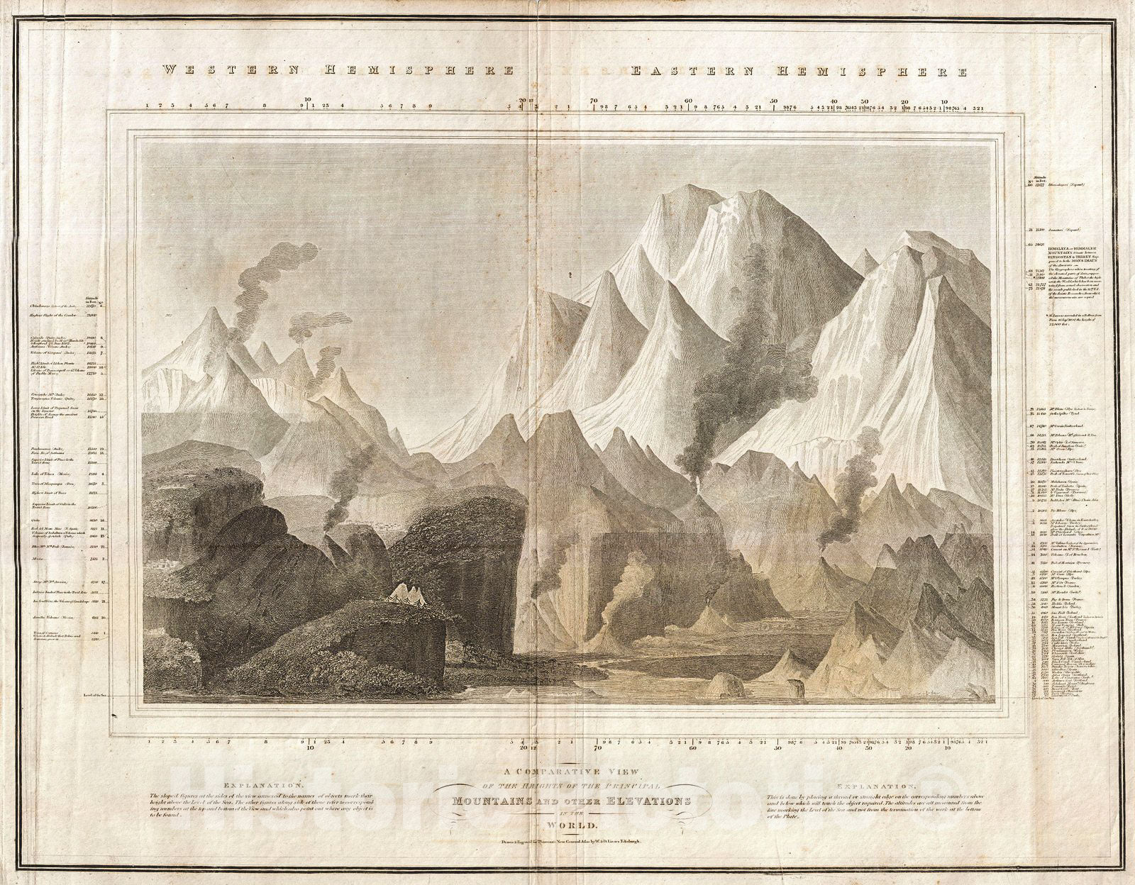 This is one of the earliest and most interesting takes on the comparative heights of principal mountains theme. Comparative mountains charts first appeared in the late 18th and early 19th century. Initially these charts focused on Europe or even signal countries, but by the early 19th century the explorations of the world's great peaks had reached a point where such a chart could be composed on a global level. John Thompson, the preeminent Scottish cartographer of the period, introduced this chart, one of the first and most interesting of the genre. Covering both the eastern and western hemispheres, this chart shows not only the heights of mountains, but also compares them to important buildings, cities, vegetation limits, and even fauna. Thompson divides his map in to the western hemisphere, on the left, and the eastern hemisphere on the right. In the Western Hemisphere, he identifies the Ecuadorian peak of Chimborazo at the highest mountains - the great Chilean peaks had not yet been discovered. Just below the summit of Chimborazo, a tiny speck represents a rare Andean Condor in flight with a highest altitude of 21,000 feet. About halfway down on the left side of Chimborazo, another little speck, this time in the shape of a man, indicated the highest elevation attained by the naturalist Alexander von Humboldt. Also identified are various high evolution towns and cities including Mexico City, Lake Toluca, Quito, and Caracas, among others. On the right hand side of Thompson's map chart, the behemoths of the Eastern Hemisphere dwarf the mountains of the west. Here, Nepal's Dhaulagiri, 27,677 feet, is identified as the world's greatest mountain. Everest and many of the other great Himalayan peaks had not yet been discovered - today we know that Dhaulagiri, though certainly a mighty peak, is only 8th. Engraved by the firm of W. and D. Lizars for John Thomson's 1817 edition of Thomson's New General Atlas .