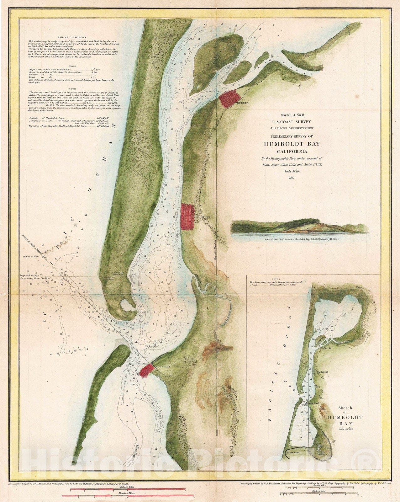 • Historic Map : U.S. Coast Survey Chart or Map of Humboldt Bay, California, Version 2, 1851, Vintage Wall Art